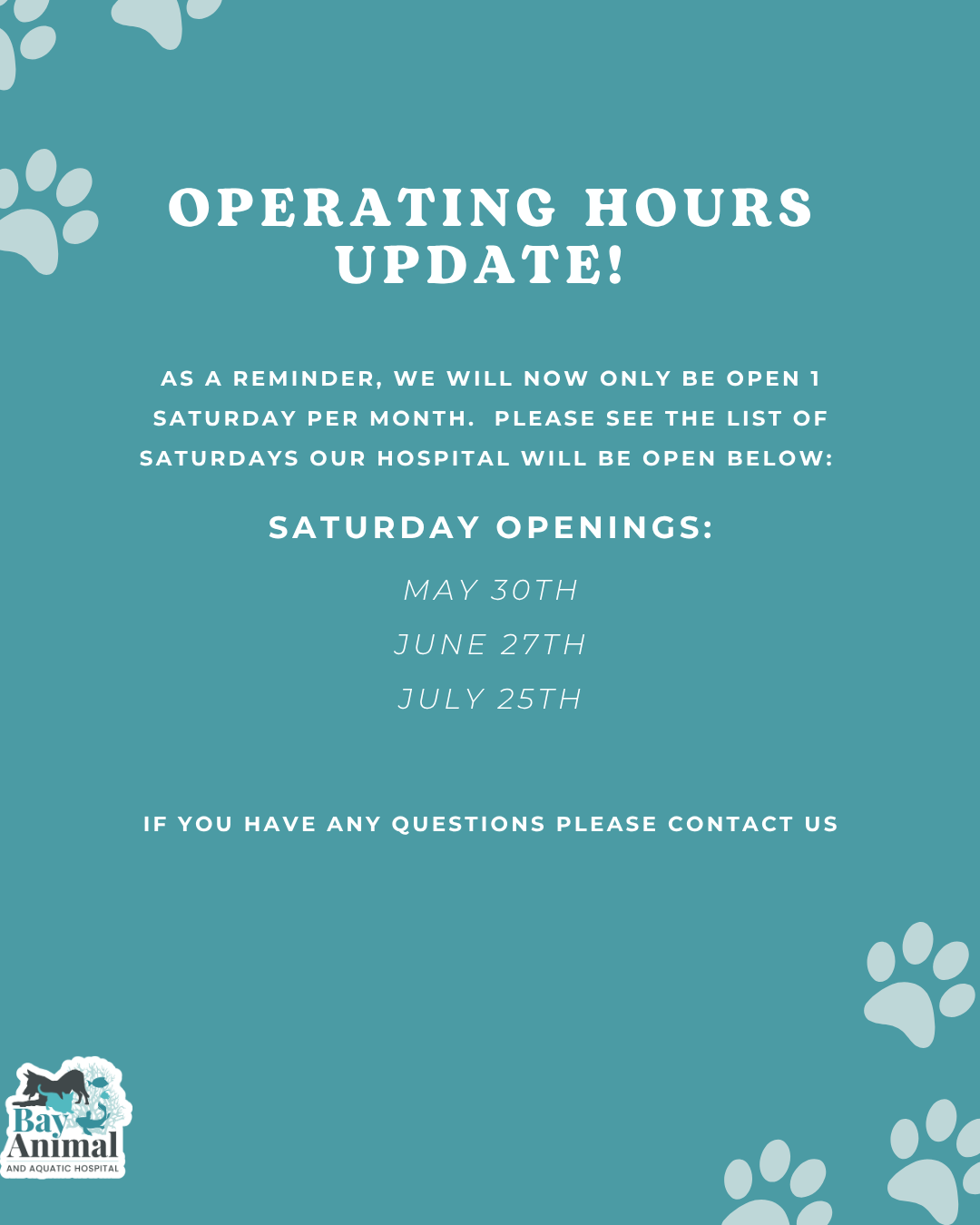 We appreciate you helping make Bay Animal and Aquatic Hospital one of the best veterinary hospitals around! We sincerely appreciate you taking the time to share your thoughts with us; your kind comments mean the world to us.